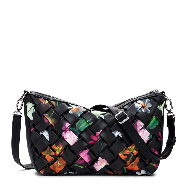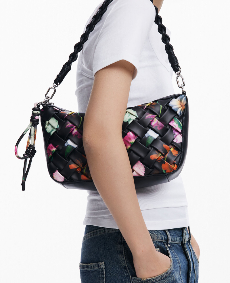Sac à main matelassé en tissu effet cuir tressé, avec fermeture éclair, anse amovible et imprimé floral