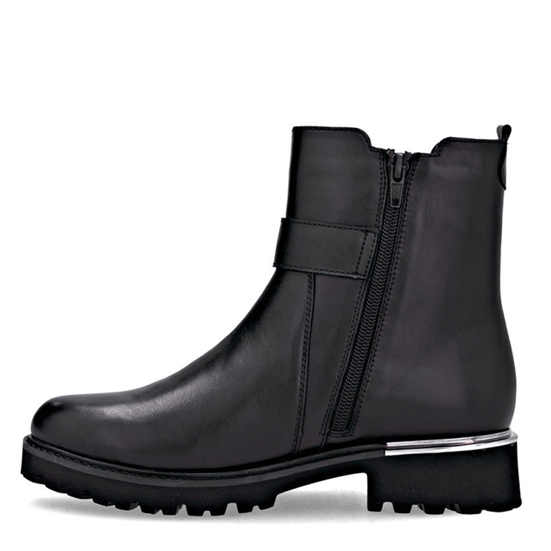 Le bottillon Remonte noir pour femme élégant, modèle D8654-00, conjugue sobriété et raffinement. Sa tige en cuir lisse noir, rehaussée d’une bande élastique côtelée et d’une bride décorative avec boucle métallique, lui confère une allure moderne et intemporelle. Polyvalent, il accompagne aussi bien vos tenues de travail qu’un look décontracté de fin de semaine.